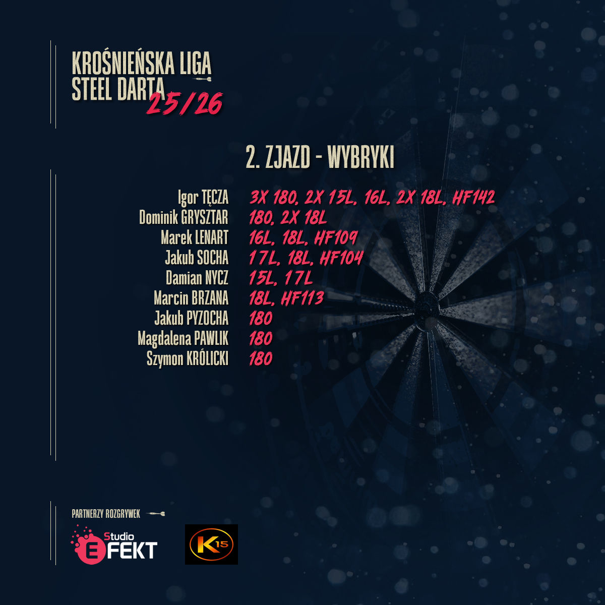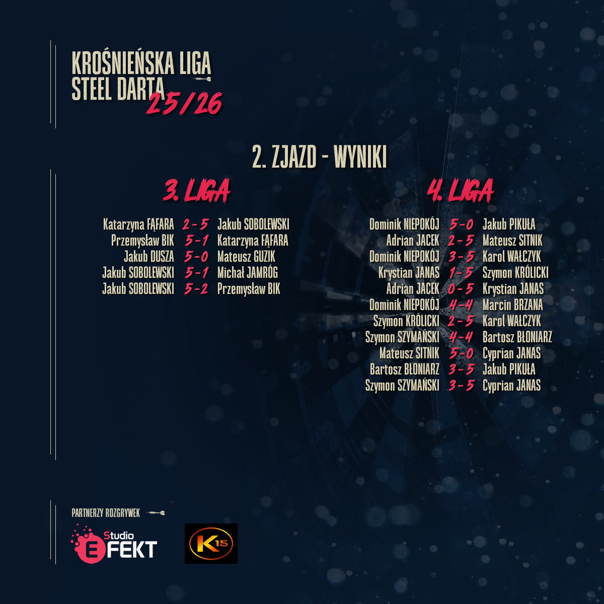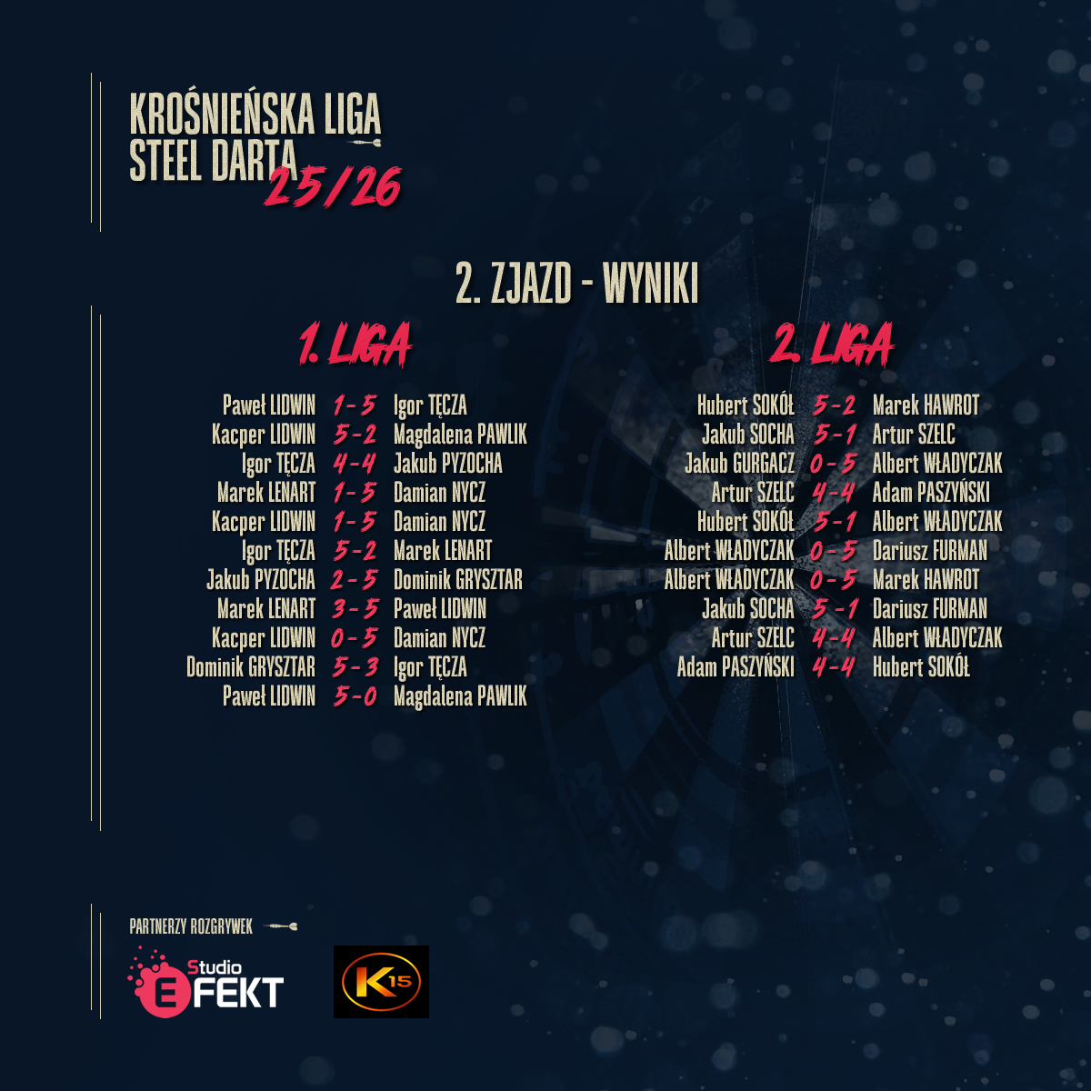 W środę i czwartek, 17 i 18 września, odbył się drugi zjazd Krośnieńskiej Ligi Steel Darta. Tak jak w poprzednich latach, spotkania prowadzone są na zmianę, więc w środę grali zawodnicy 1. i 2. Ligi, a w czwartek 3. i 4. Ligi. Z udziału w lidze zrezygnował Karol Socha, a zgodnie z regulaminem wszystkie jego mecze zostały anulowane.