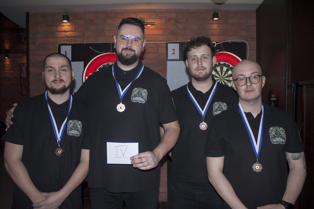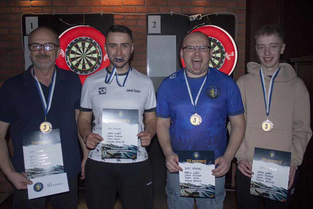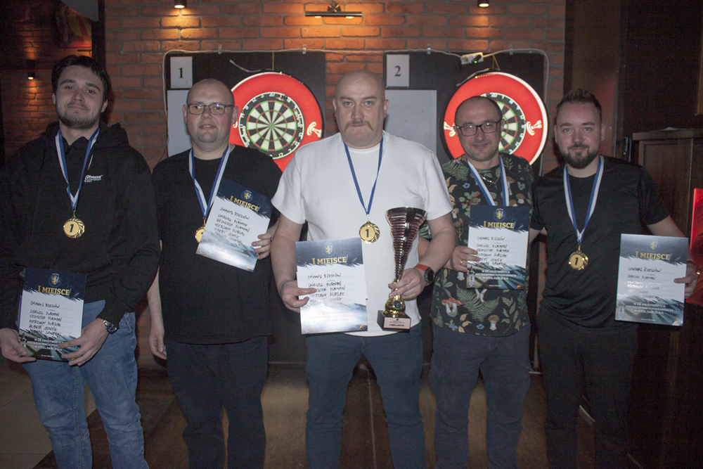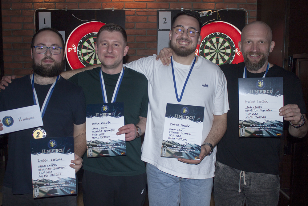 Pierwszy półfinał można określić przedwczesnym finałem. Na papierze – dwóch faworytów, a zwyciężyć mogła tylko jedna ekipa. Zmiana! Rzeszów i Dart Krosno przez 6 legów walczyli łeb w łeb, lecz ostatnie dwa legi to pokaz umiejętności ekipy z Rzeszowa i to oni drugi rok z rzędu znaleźli się w finale. Wynik: 5:3. W drugim półfinale ekipa Random Rzeszów górowała nad Młodą Kanciapą, która ugrała tylko jednego lega. Wynik: 5:1. Jedyny w roku mecz o 3. miejsce zwyciężyli zawodnicy Dart Krosno. Finał to piękny start Zmiany! Rzeszów – trzy pierwsze legi na ich korzyść, ale 14. lotka ekipy Random dała nadzieję na zmianę wyniku. W kolejnym legu dorzucili 17. lotkę i ten piękny sen mógł trwać dalej. Filip Kula jednak chybił w środek przy zamknięciu 167 punktów (i 18. lotki), przez co leg powędrował do obrońców tytułu. Ostatecznie Zmiana! Rzeszów zwyciężyła z ekipą Random Rzeszów 5:2 i tym samym obroniła tytuł sprzed roku. Dla całej czwórki przygotowaliśmy pamiątkowe medale, najlepsze trzy miejsca otrzymały dyplomy, a na ręce zwycięskiej drużyny wylądował puchar Drużynowych Mistrzów Podkarpacia.